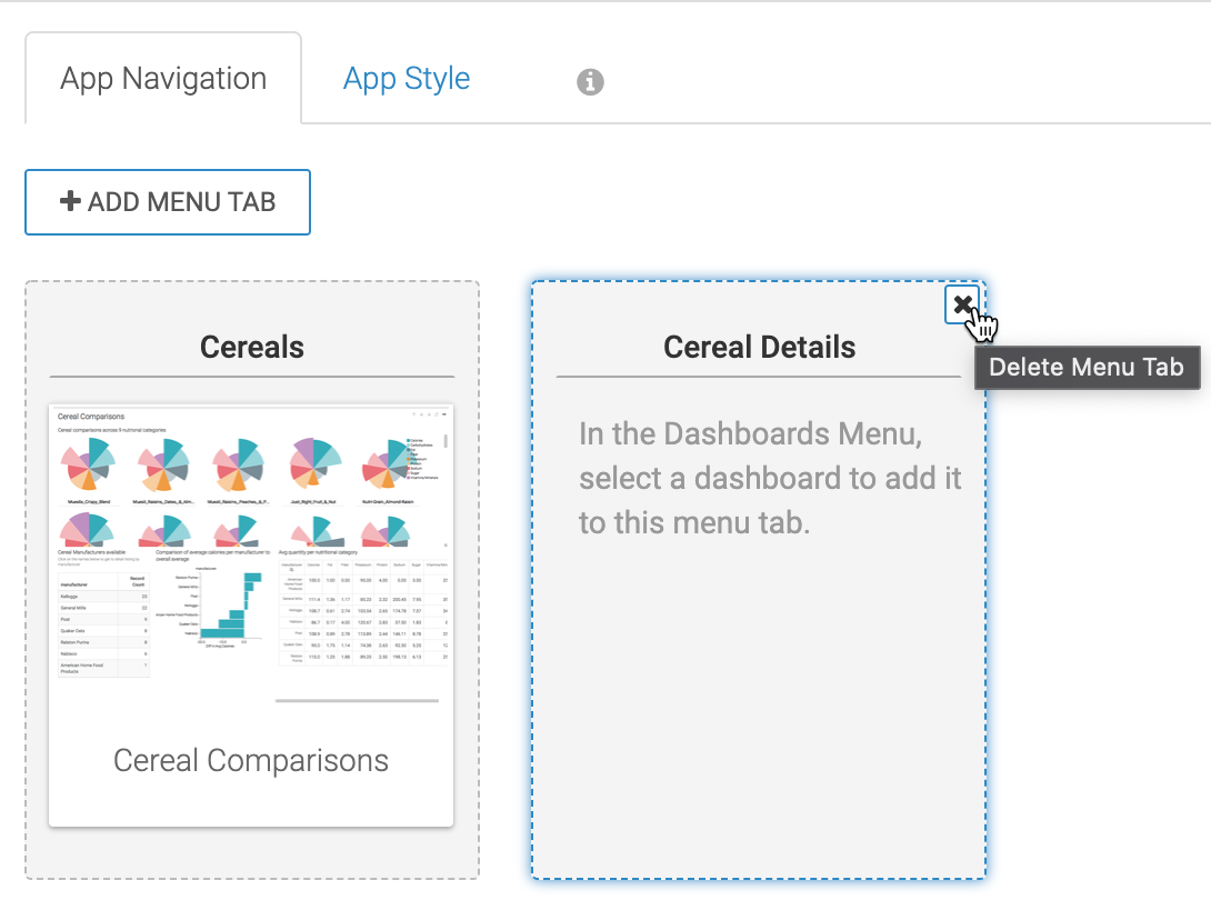 Removing a tab from an application In a CDP Data Visualization application, you can easily delete tabs and the dashboards they contain. In the App Navigation interface, hover over the top of a tab, and click the (remove) icon. The App Navigation interface no longer shows the deleted tab. To ensure that the change persists, click Save.