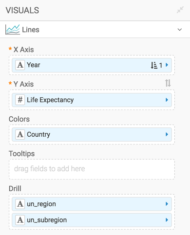 To limit the fields available for drill-into to a smaller subset, you must place these fields onto the Drill shelf. When specifying a limit for Choropleth Map fields, these fields must be Geo Type fields, or cast to Geo Type.
