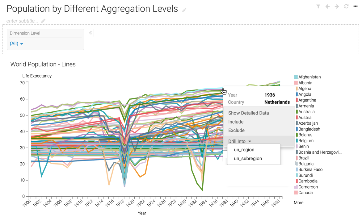 By default, all dimensions are visible when implementing drill-into data discovery, but you can limit the available fields to a smaller subset.