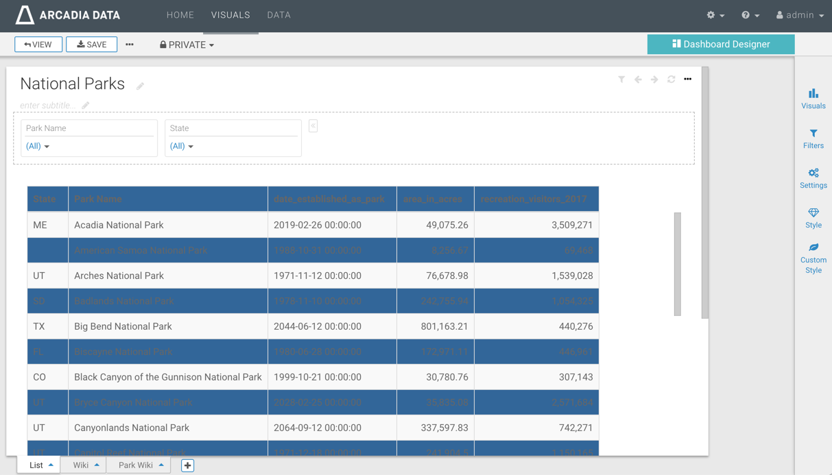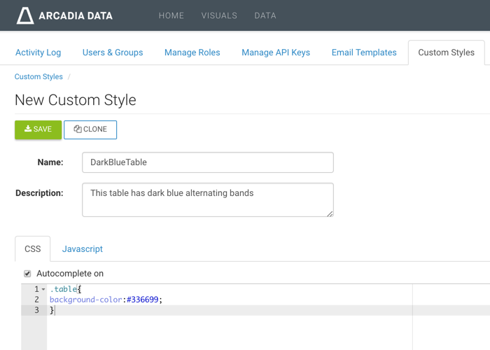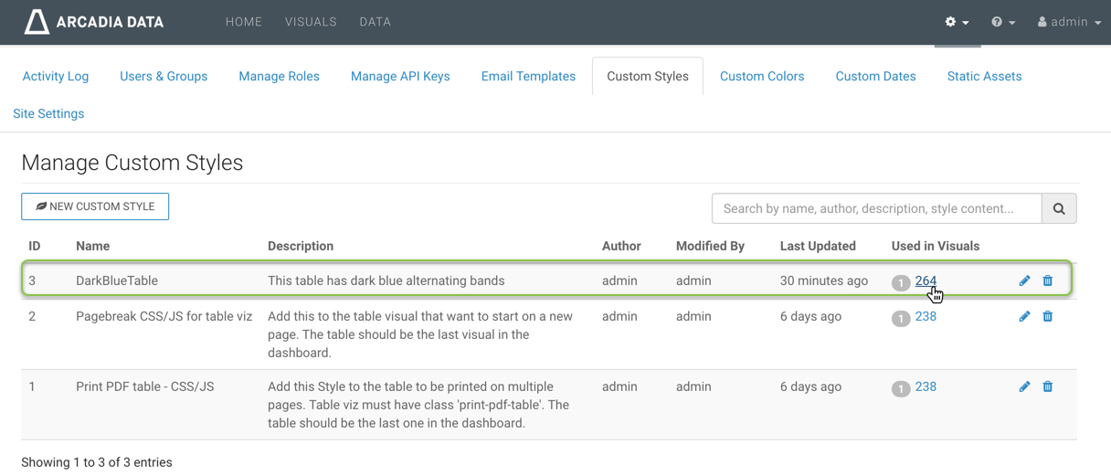 Note that the Manage Custom Styles interface keeps track of all visuals that use each defined style. In the following image, you can see the reporting after applying the style DarkBlueTable to visualization 15. Note also that the number 15 is an active link to that visualization.
