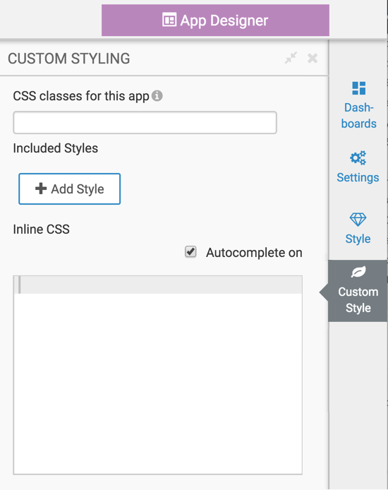 Adding custom styles to apps CDP Data Visualization enables you to add custom styling to applications. To use the Custom Style menu, follow these steps. On the right side of App Designer, click the Custom Style menu. Select one of the following options. Adding CSS classes to applicationsAdding included styles to applicationsAdding inline CSS code to apps
