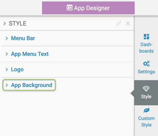 Customizing app background To get to the options in the Background style menu of the App Designer, follow these steps. On the right side of App Designer, click the Style menu. In the Style menu, click Background. Select one of the following options. Changing app background colorRemoving dashboard shadowParent topic: Changing application style