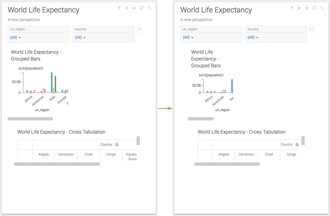 For example, we increased the horizontal margins from 10 to 35 in the following dashboard. Notice that both visuals are shifted to the right, but the filter controls remain stationary.