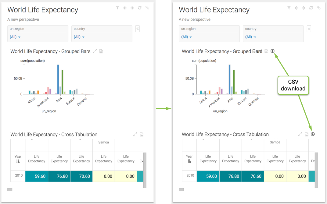 For example, compare the two visuals: one without CSV download options, and the other that shows the CSV download functionality for each visual.