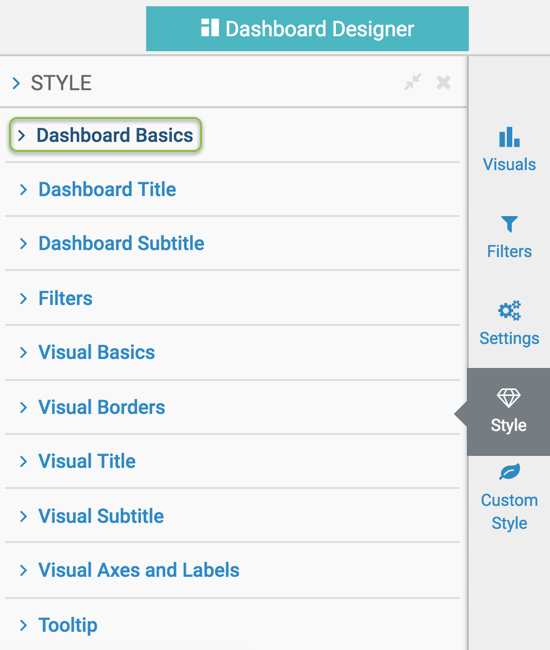 Basics styles You can adjust several style options for basics in CDP Data Visualization dashboards. To get to the options in the Dashboard Basics menu, follow these steps: On the right side of Visual Designer, click the Style menu. In the Style menu, click Dashboard Basics. Select one of the options. Dashboard text colorYou can change the color of the text in the dashboard in CDP Data Visualization.Dashboard background colorYou can change the color of the background in the dashboard in CDP Data Visualization.Dashboard page background colorYou can change the color of the page background in the dashboard in CDP Data Visualization.Parent topic: Customizing style for dashboards