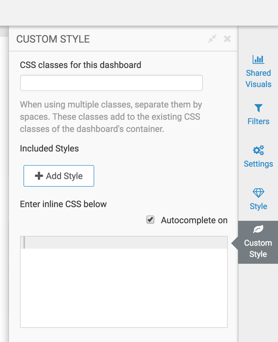 Adding custom styles to dashboards CDP Data Visualization supports several options for custom styling on dashboards. To change the options for custom styles on dashboards, follow these steps: On the right side of Visual Designer, click the Custom Style menu.In the Style menu, choose from the available custom style options. Adding CSS classes to dashboardsYou can add CSS classes to CDP Data Visualization dashboards.Adding included styles to dashboardsYou can add defined styles to all visuals in CDP Data Visualization dashboards.Adding inline CSS code to dashboardsYou can apply simple formatting to visuals with CSS code snippets in CDP Data Visualization dashboards.