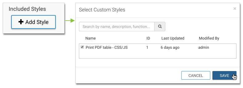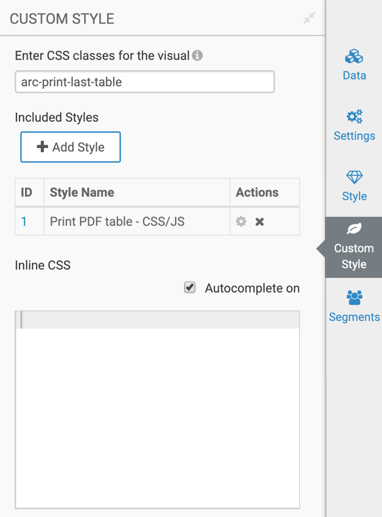 Add the style we created earlier, Print PDF table - CSS/JS, to the visual. For more information, see Adding included styles to visuals .