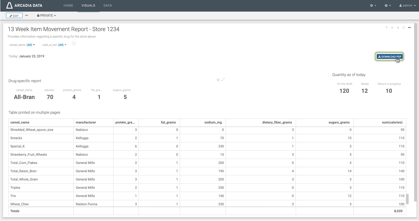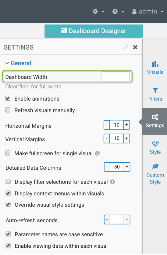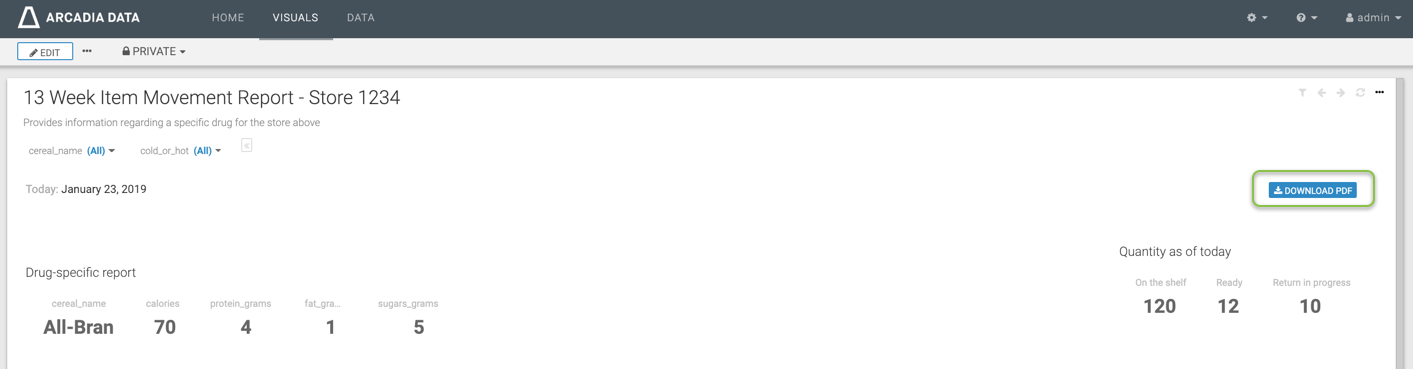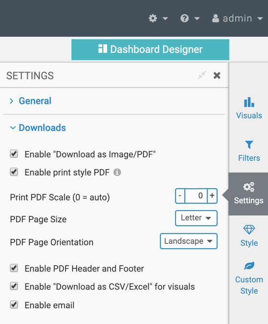- Specify dashboard downloads settings to print the dashboard using the PDF