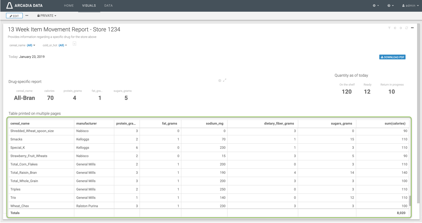 This customization example shows you how to build an embedded dashboard that prints the full contents of a table as part of a dashboard print. This dashboard contains visuals at the top, and a table at the bottom. The table prints as many pages as necessary to display all rows. Table headers repeat at the top of each page. Several custom styles are used to achieve the desired outcome.