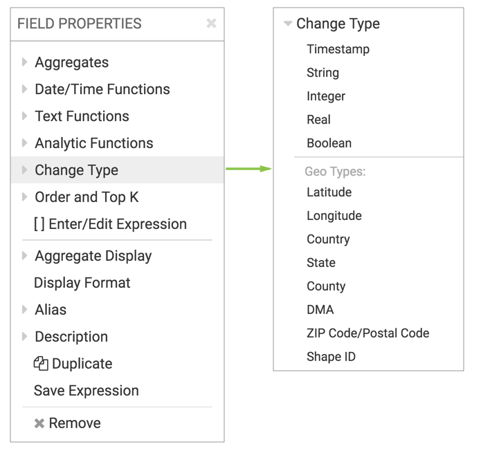 Geo Types is a grouping of types that make the field usable on the Geo shelf of Map and Interactive Map visuals.