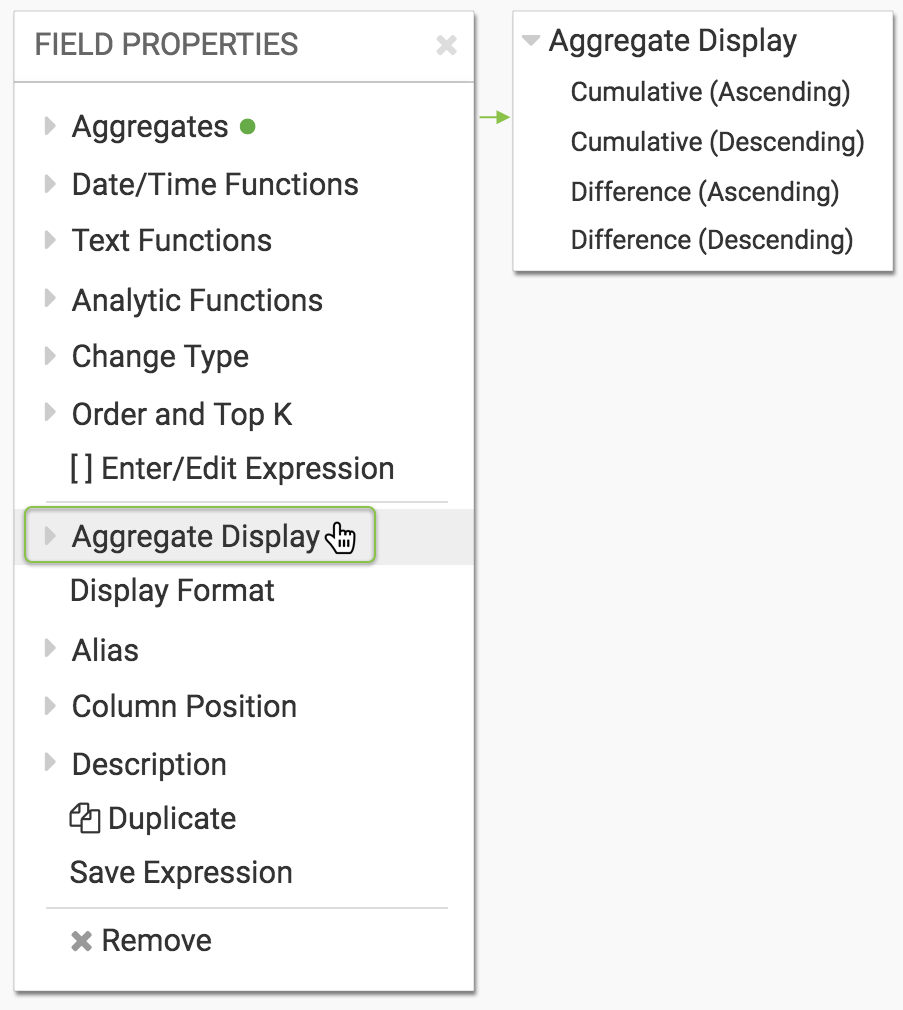 CDP Data Visualization gives you the option to display aggregate functions with different options: as is, cumulative (ascending or descending), and as difference (ascending and descending).