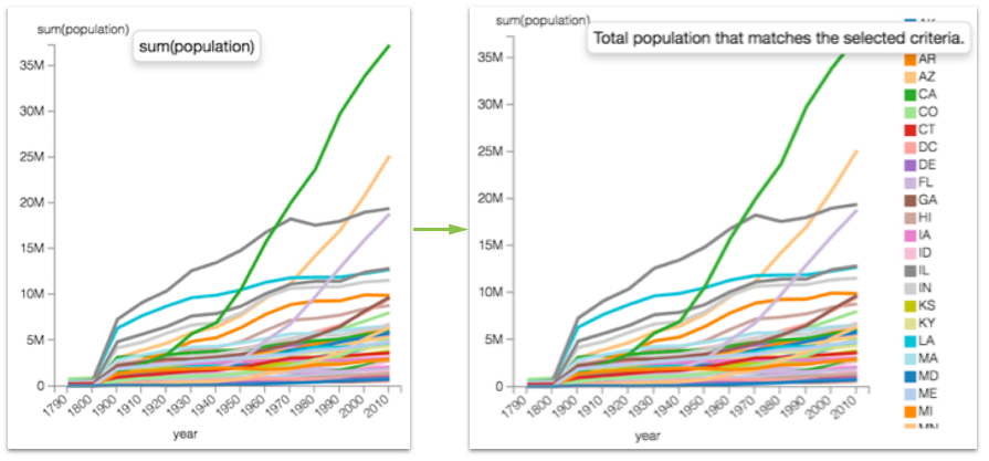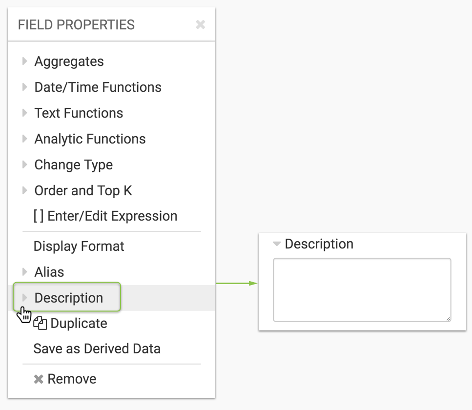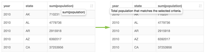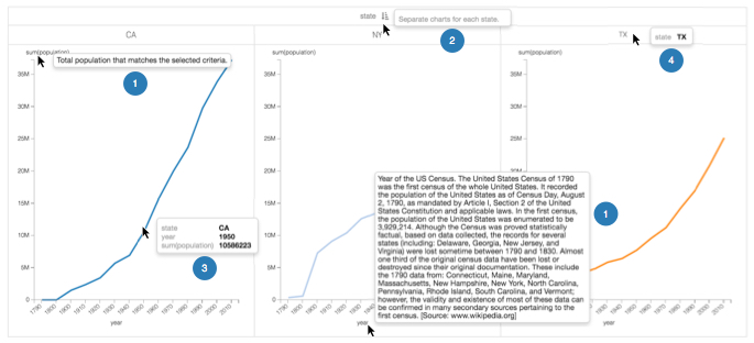 CDP Data Visualization provides you with an option to add a meaningful description to chart elements; this description can be viewed when hovering the pointer over the table or chart.
