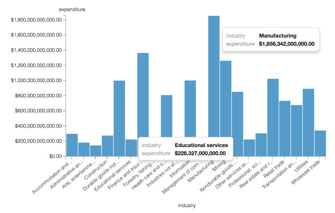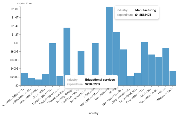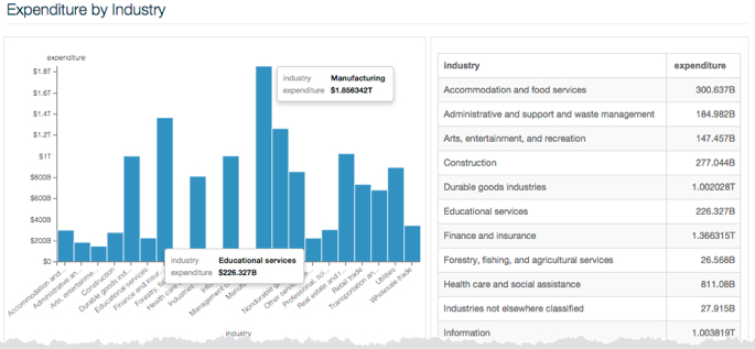 The new display format more clearly categorizes the magnitude of the currency, with Educational Services expenditure valued at approximately $226 Billion, contrasting with Manufacturing at nearly $2 Trillion, for the years covered by the data.