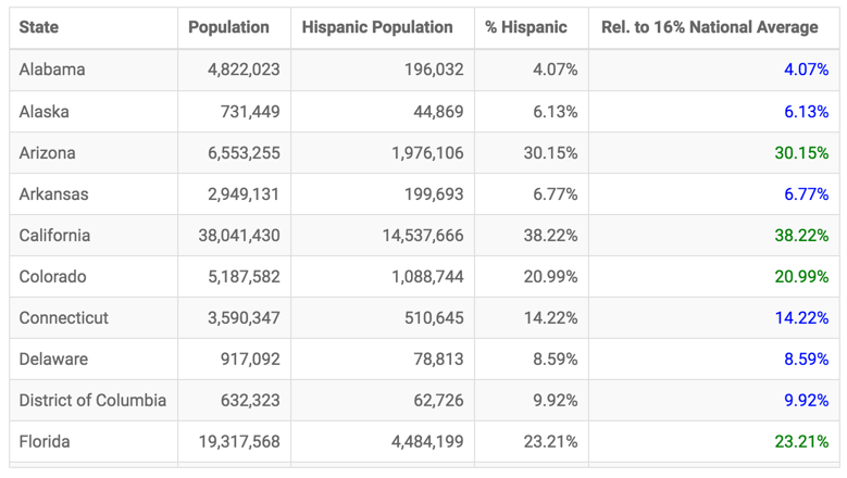 In the following example, we adapted the custom JS format to more clearly identify which US States have a Hispanic population over or under the national average of 16%.