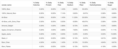 To calculate the percentage of daily recommended intake that a portion of each cereal represents, edit the expression of each field to divide by daily values.