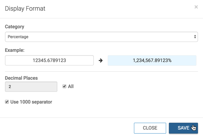 For all the fields on the Measures shelf, change the Display Format to Percentage, select a 2- decimal display, and click Save.