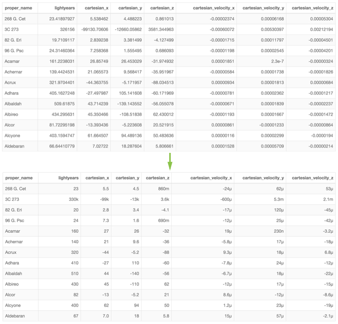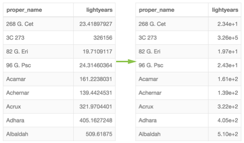 Notice the change to the number format in column lightyears.