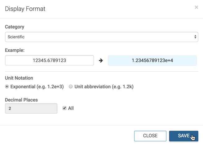 Data Visualization enables you to specify scientific display format for a numerical field, both in exponential form, and using unit abbreviation.