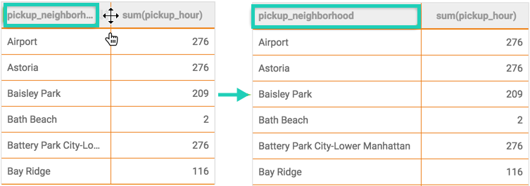 When the column width is smaller than the length of the text in the cell, the text is abbreviated, and a series of three dots (ellipsis – …) appear at the end of the line. The first column heading text of the left visual is displayed as 'pickup_neighborh...'. In such cases, you can hover over the table cell to see the full text.
