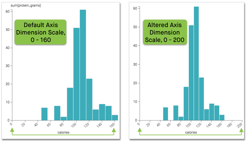 Image on the left shows the minimum and maximum scale of the X axis from 50 to 160. Notice that in the right image, the scale changes when we change the values from 0 to 200. Increasing the scale also gives a clearer visual representation of where the calorie levels fall within a range of values.