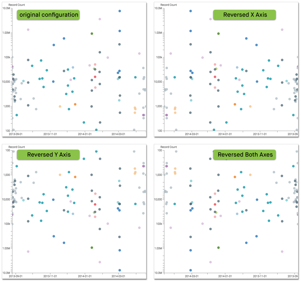 The following image demonstrates the possible scale direction options for a scatter plot: original, reversed x axis, reversed y axis, and both x and y axes reversed.