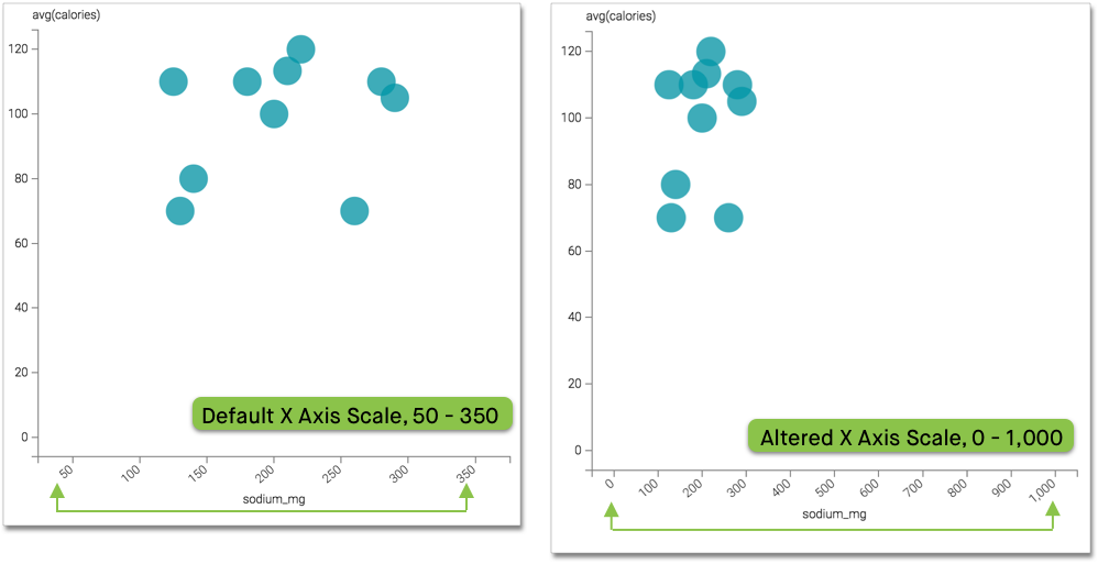 To change the minimum and maximum scale of a continuous X-axis, navigate to the Axes menu, and make adjustments to the two selectors for the Min X Scale and Max X Scaleoptions.