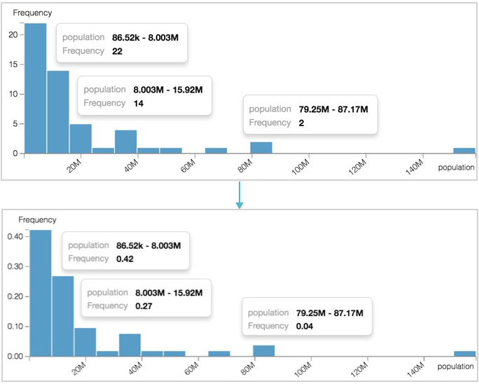 The following image shows the two versions of the histogram. You can see that the change appears in the vertical axis and the tooltip, where frequency is reported as a number of incidents on the upper graph, and as a percentage on the lower graph.
