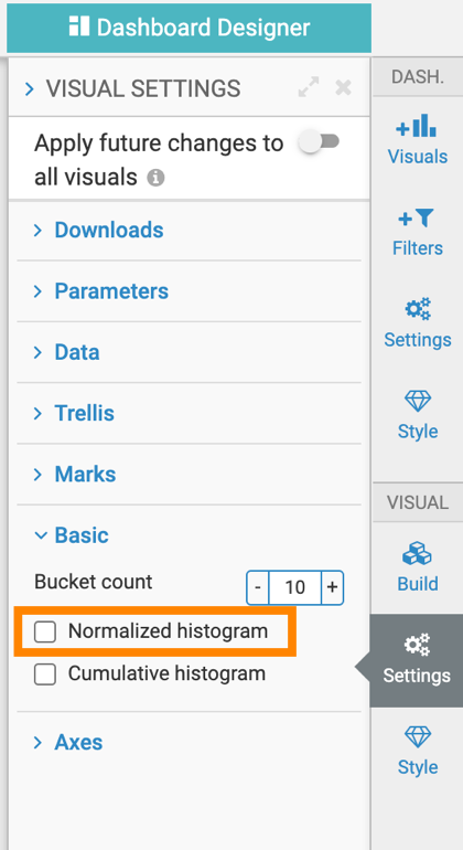 To normalize a histogram, click Settings in the VISUAL menu, open the Basic section, and select the Normalized histogram option.