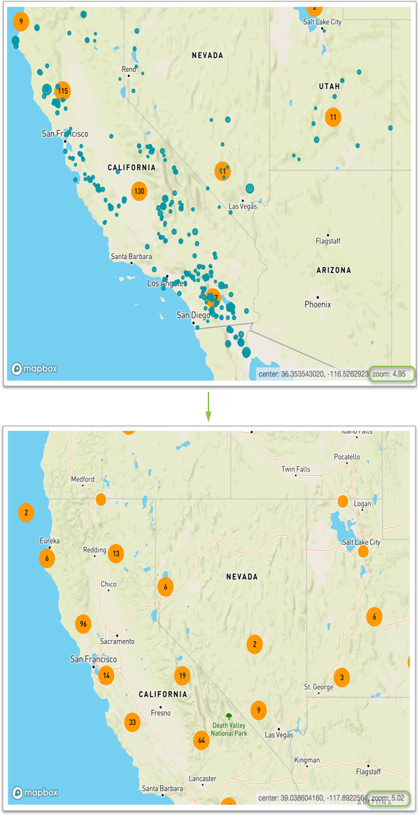 Sometimes, it is not possible to display data legibly at a given zoom level. CDP Data Visualization enables you to adjust the visible zoom levels in circles.