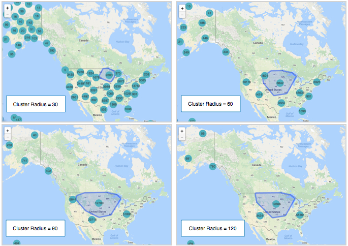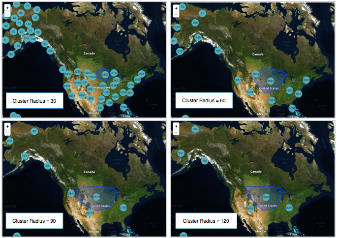 Similarly, note the change for the same cluster radius options on the Mapbox map.