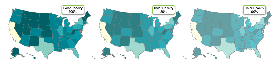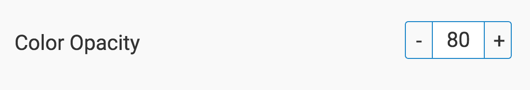 The default value is 80 %. Click the - sign to make the colors more transparent by decreasing color opacity by 10% with each click. To increase color saturation, click the + sign to increase color opacity by 10%. Edit the number in the center of the selector to get a custom value. Valid values range from 1% for the palest through 100% for the brightest colors. A value of 0 generates a visual with full saturation.