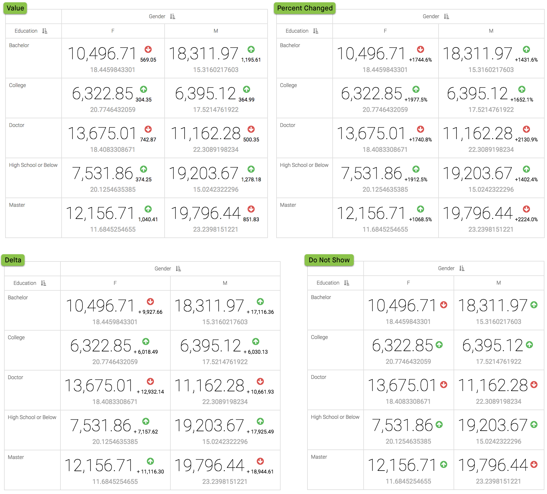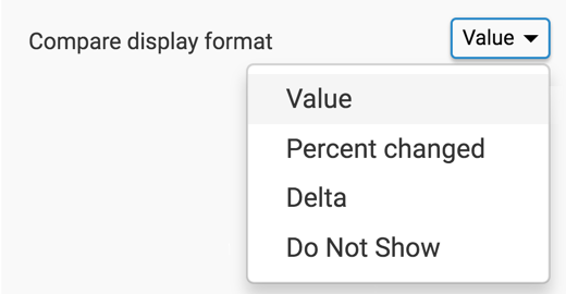 This image illustrates the visual with compare indicator displayed as a Value, Percent Changed, Delta, and Do Not Show.