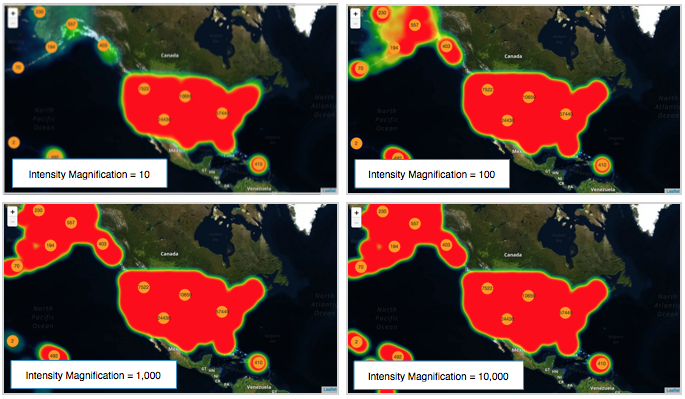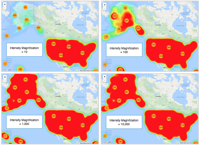 setting intensity magnification on Google Map to 10, 100, 1,000,