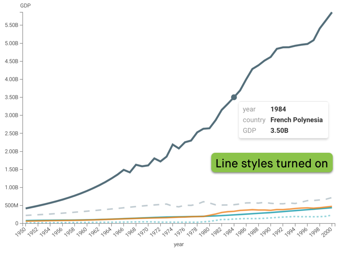 If you hover over a line, the line style changes from a dotted (or dashed) line to a solid line, and the tooltip appears.