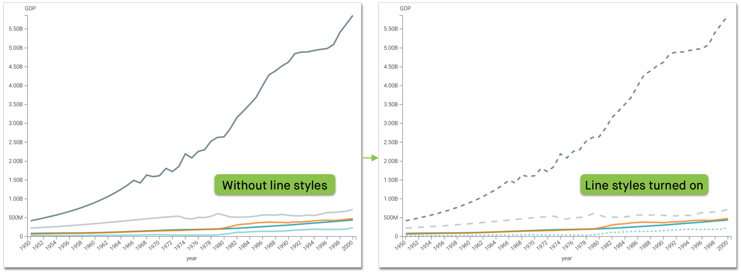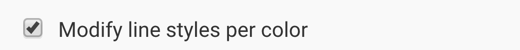 To modify each line of a visual to a different style, navigate to the Marks menu, and check the Modify line styles per color option.