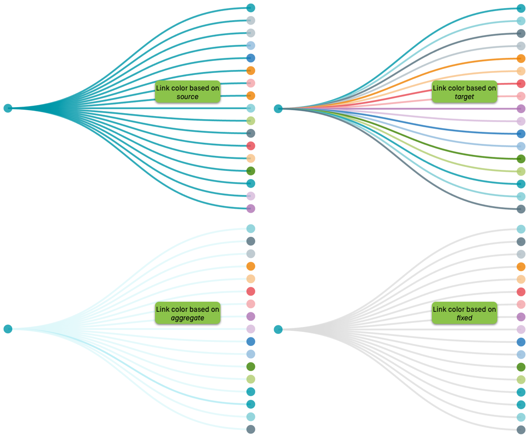 Here, compare the same dendrogram visual with links based on source, target, aggregate, and fixed.