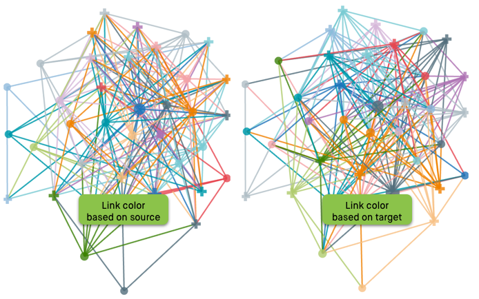 Compare the appearance of a network visual with links based on source node, and links based on target node.