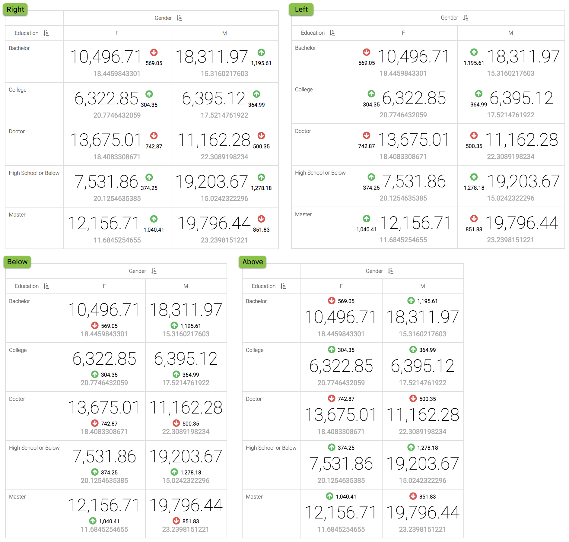 This image illustrates the visual with compare indicator displayed to the right, left, below, and above the main indicator.