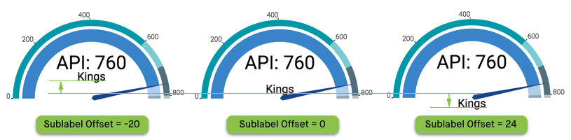 By default, the offset (vertical position) for the secondary label in gauge charts is 0. To change it, navigate to the Marks menu, and select a new value for the Sublabel Offset option.