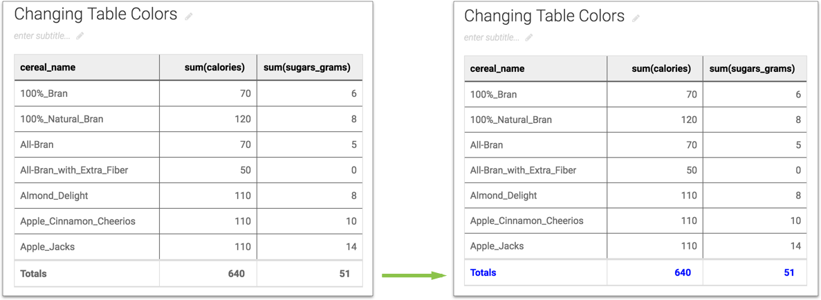 In the following example, notice the difference in the totals row before and after changing the text color of the totals row.