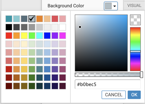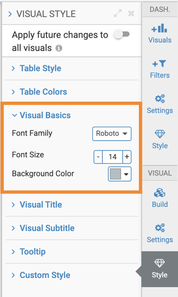 Changing background color of a visual On the right side of Visual Designer, click Style in the VISUAL section of the menu bar. In the Style menu, click Visual Basics. To change the background color of the visual, use the color selector. Parent topic: Customizing visual basics