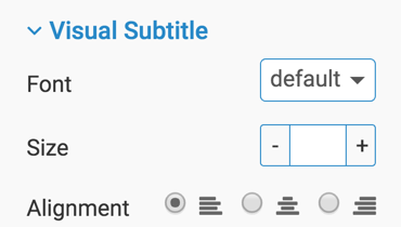 Changing font family in the subtitle of a visual On the right side of Visual Designer, click the Settings menu. In the Settings menu, click Visual Title. To change the font used by the subtitle of a visual, navigate to the Visual Subtitle menu, open the Font Family menu, and make a selection. Parent topic: Customizing visual subtitle