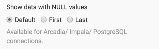 To change the order in which NULL values appear in the visual, navigate to the Data menu, and select one of styles under the heading Show data with NULL values: Default, First, or Last.