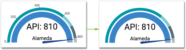 By default, the axis wraps around the outer arc of a gauge chart, and shows measurements as evenly-spaced tick marks. To hide the tick-marks, navigate to the Marks menu, and de-select the Display axis ticks option.