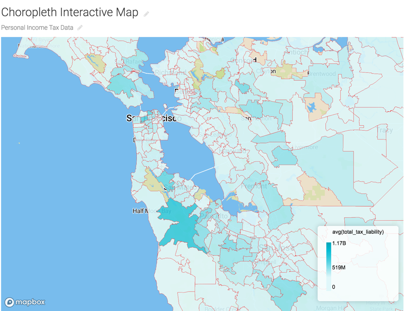 colors showing the average tax liability in California by zip code.