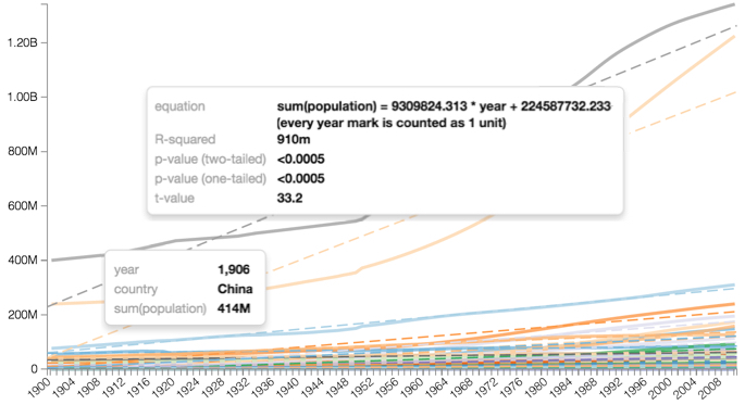 Here is a line visual with trendlines. In the following example, notice that a linear trendline clearly shows that population of China has consistently risen over the years.