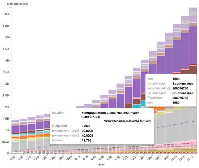 Here is a bar visual with trendlines. In the following example, notice that a linear trendline clearly shows that the population of Southern Asia has consistently risen over the years.