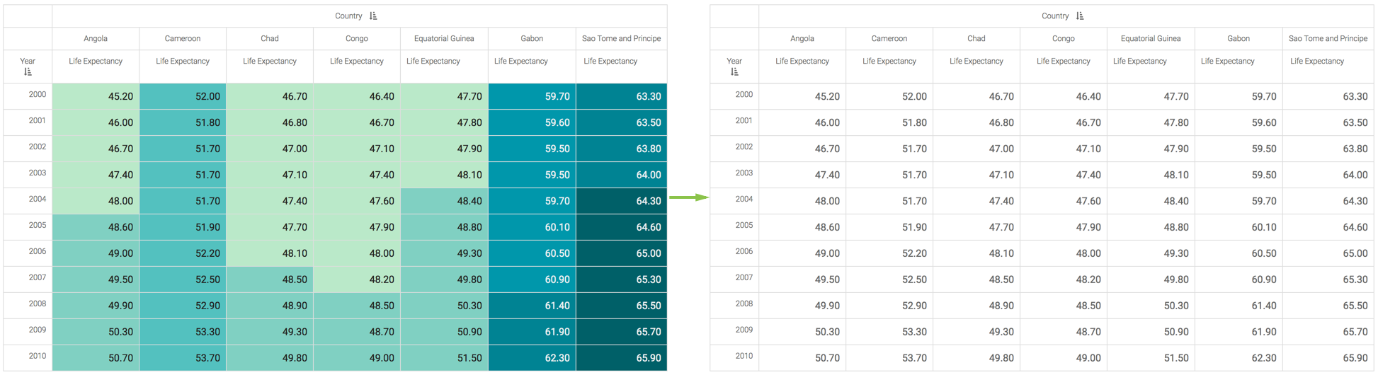 Compare the 'enabled-color' cross tabulation visual (default behavior) with the appearance of the 'disabled color' visual.