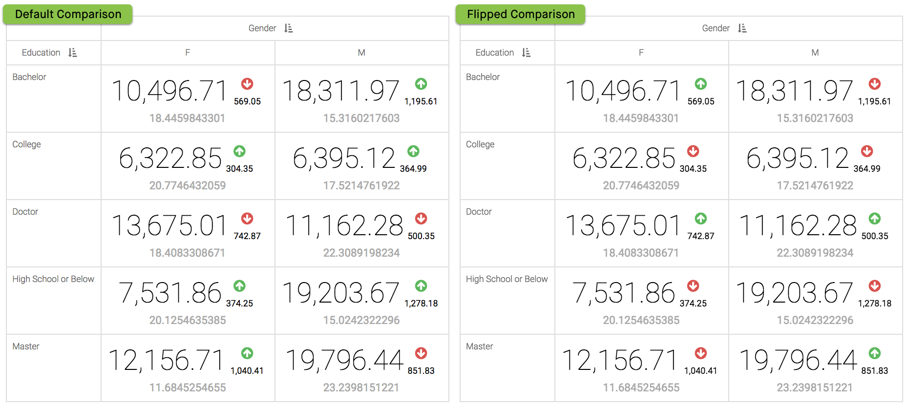 This image illustrates the visual with the default comparison setting, and with the flipped comparison. Note that the arrows flipped.