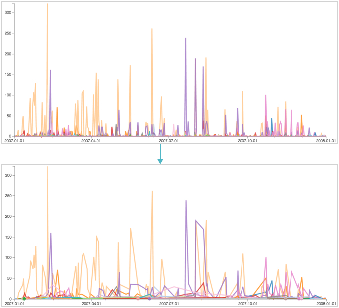 When date/time information is missing from a dataset, the corresponding values plot as zeros on line and area graphs. It is possible to "smooth" the data by interpolating the missing values.